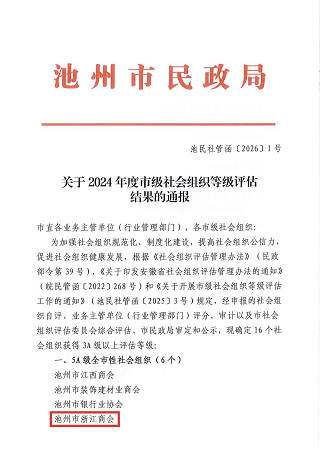 近日,池州市民政局正式发布2024年度市级社会组织等级评估结果,池州市浙江商会凭借过硬的综合实力、规范的内部治理与突出的发展成效,成功获评最高等级的5A级全市性社会组织,这一荣誉不仅是对商会发展成果的权威认可,更彰显了其在党建引领、服务会员、践行社会责任等方面的标杆示范作用。